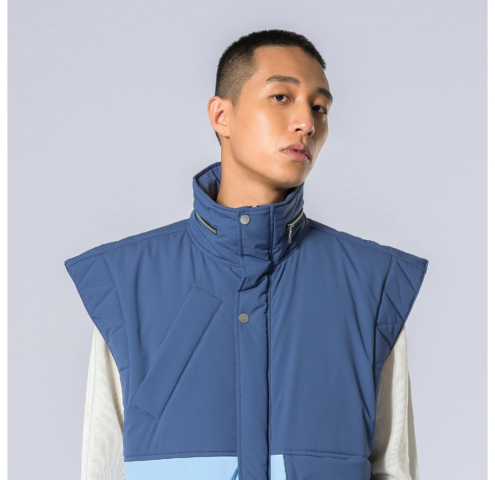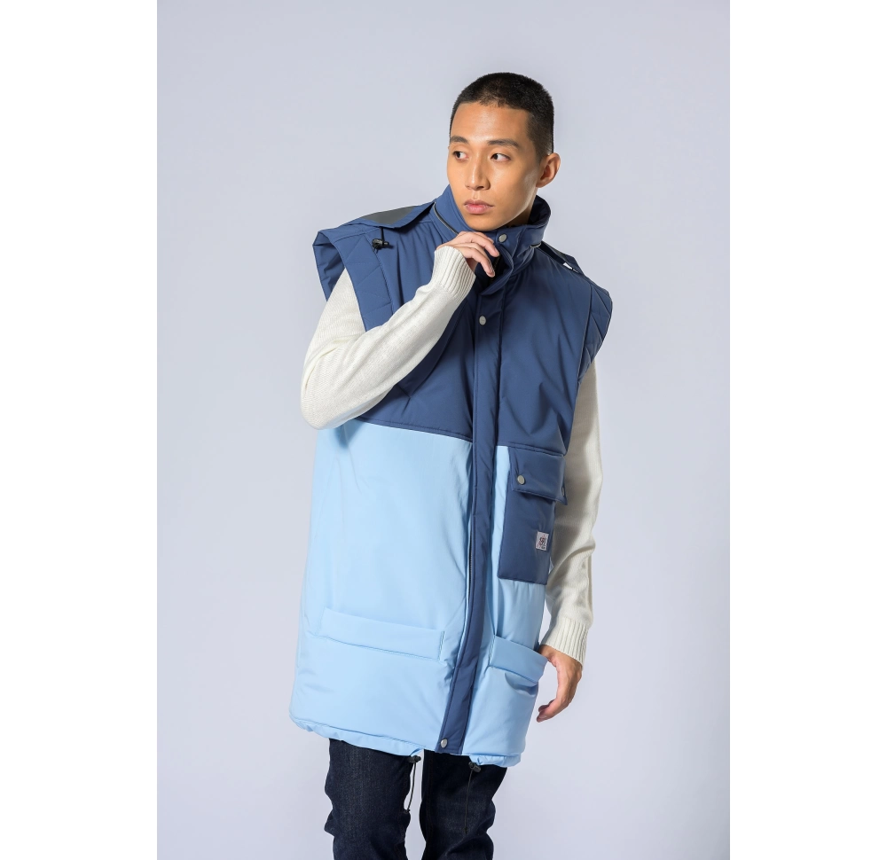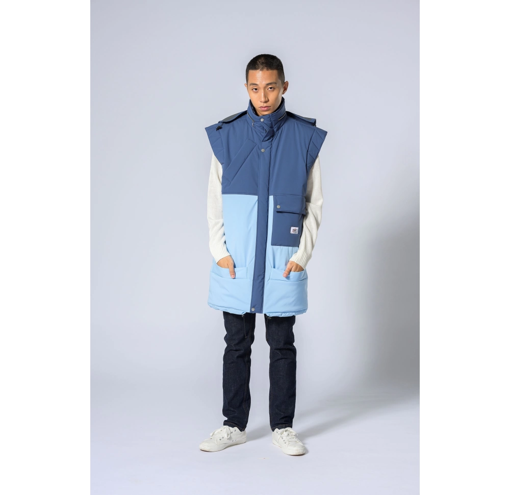 Soft touch surface, water resistant. Sleeveless jacket, large quilted outline shoulders. Colour block areas. Big flap pocket and rightside oblique pocket layer.